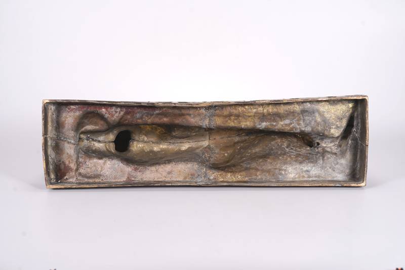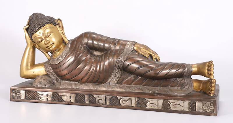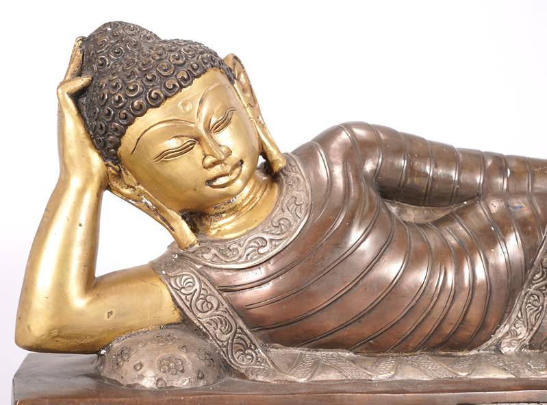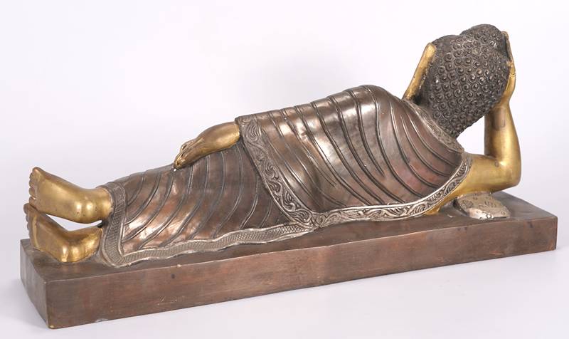 Wohl Thailand. Dreifarbiger Metallguss (gold-, silber- und bronzefarben). Parinirvana Buddha. Buddha liegt friedlich auf der Seite, den Kopf auf seiner Hand ruhend. Er steht kurz vor dem Eintritt ins Nirvana. Größe ca. 51 x 14 cm, Höhe ca. 23 cm, Gewicht ca. 8 kg.