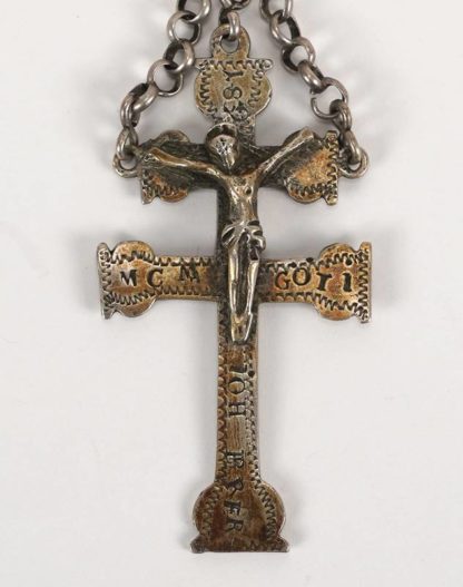 Rosenkranz Wohl deutsch 19. Jh. Ehemals versilbert. Kette aus schwarzen Holzperlen im Wechsel mit Kettengliedern. Ein roter Schmuckstein, ein Stern und ein Kreuz. Länge ca. 58 cm. Altersbedingter Zustand.