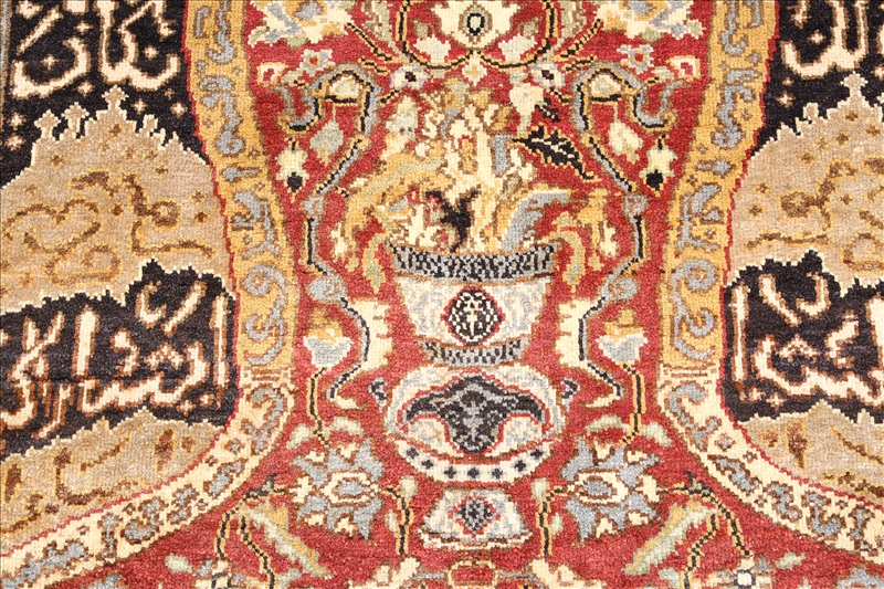 20. Jh. Seidenanteil. Mehrfachbordüre mit floraler Ornamentik und stilisierte Mihrab im Mittelfeld ebenfalls in schöner floraler Ausführung. Im oberen Teil Schriftzeichen. Größe ca. 189 x 120 cm, ca. 20 Knoten / qcm. Gewicht ca. 6,5 cm. War als Wandteppich mit Ösen konzipiert.