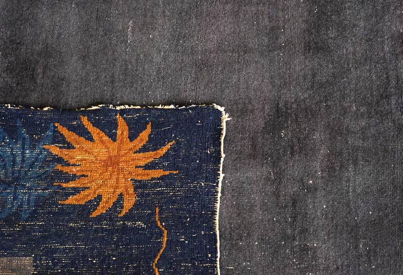 Baotou um 1900. Breite, blaue Bordüre mit dunkelgrauem Innenfeld. Rechter und unterer Rand mit Darstellungen von Pflanzen, oben links Vögel. Größe ca. 350 x 270 cm, ca. 3 x 4 Knoten/qcm. Starke Gebrauchspuren, stellenweise stark abgelaufen. Verso ehemaliges Reinigungsetikett.