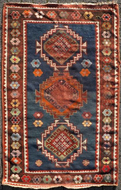 Kasak Um 1920, Wolle. Einfachbordüre mit drei Medaillons auf blauem Innenfeld. Blumen in der Bordüre und im Innenfeld. Größe ca. 195 x 120 cm, ca. 25 Knoten/qcm. Teils berieben, teils restauriert.