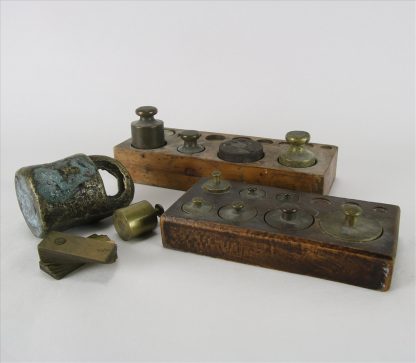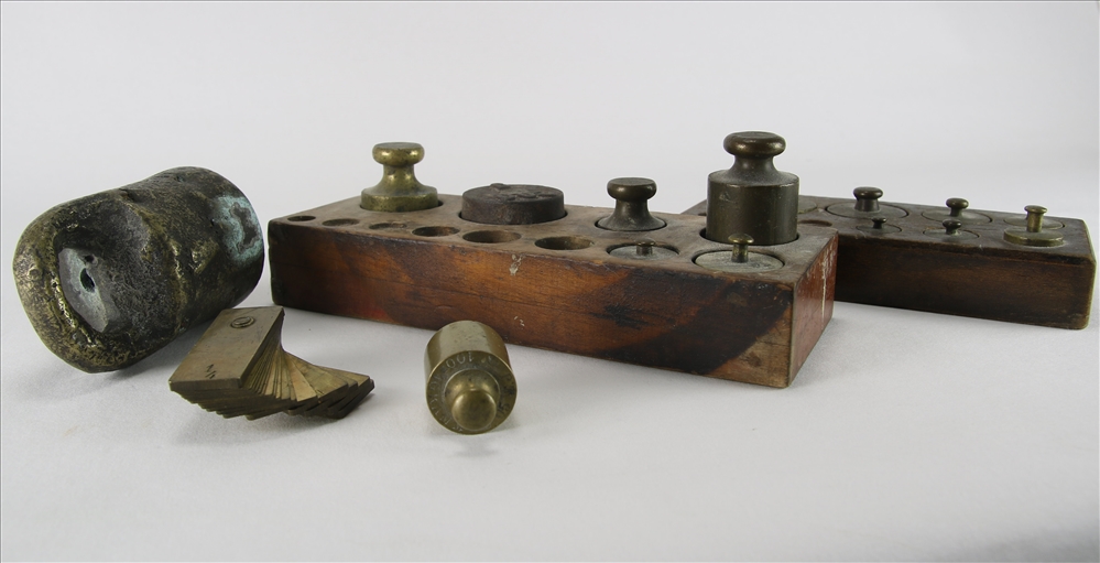 Meist 19. Jh. Diverse Gewichte in zwei Holzbehältern. Zusammen ca. 3 Kilogramm.