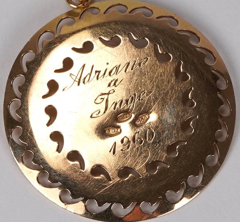 Schutzanhänger Deutsch 20. Jh. Gelbgold 750 punziert. Bildnis der Muttergottes auf durchbrochen gearbeitetem Anhänger. Verso Widmung. Durchmesser ca. 3 cm, Gewicht ca. 4,4 Gramm.