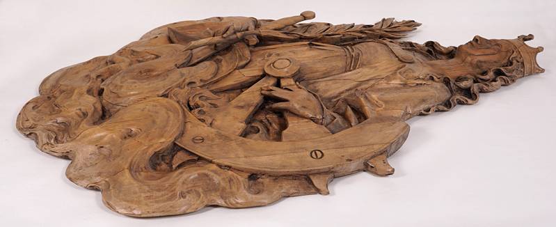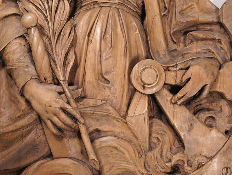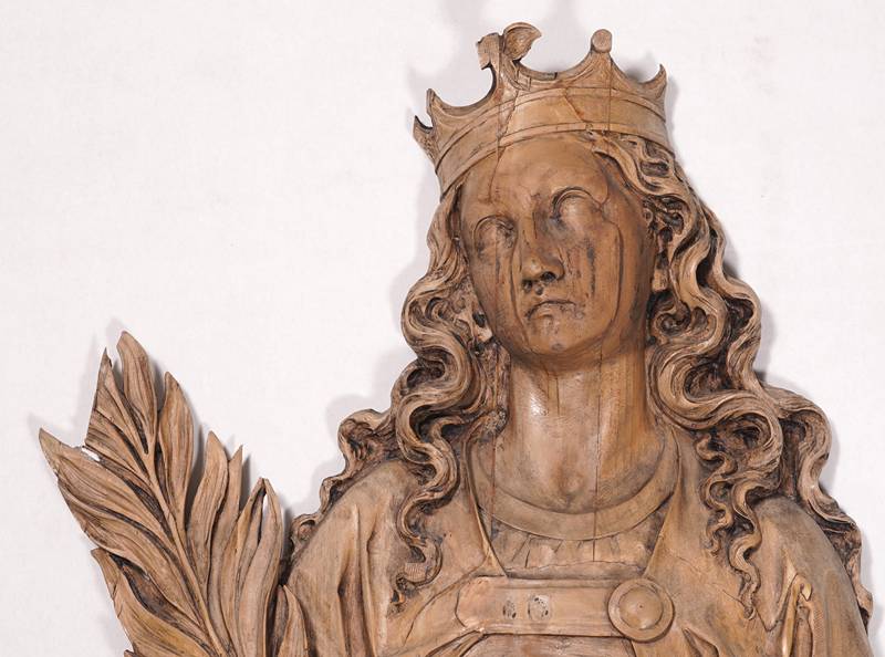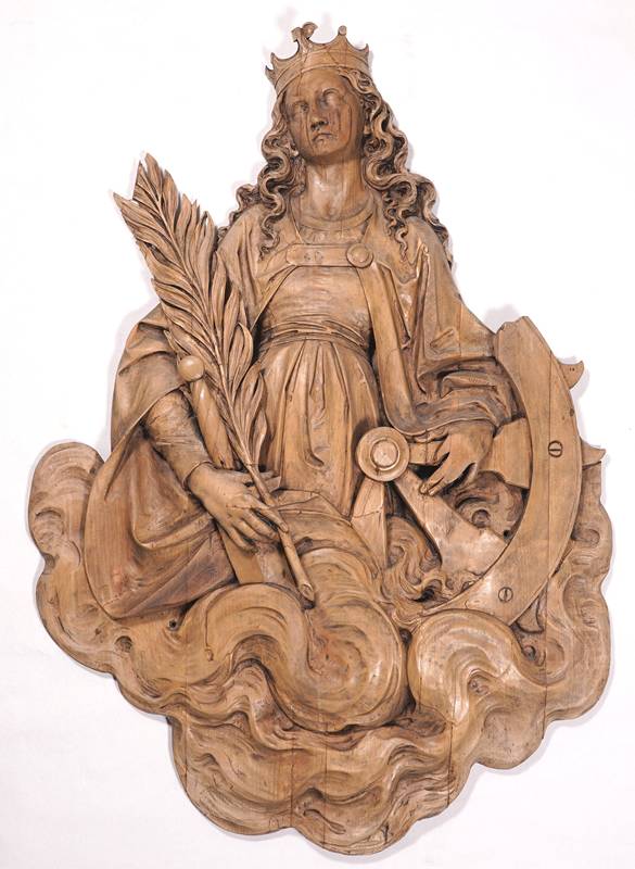 1460 Heiligenstadt - 1531 Würzburg, Nachfolge/Umkreis. Heilige Katharina mit Rad und Palmwedel. Holz, dreiviertelrund geschnitzt, verso mit Holzplatte verstärkt. Größe ca. 101 x 70 cm. Gewicht ca. 10,6 kg. Teils bestoßen.