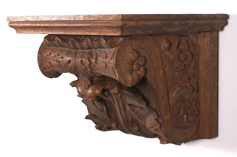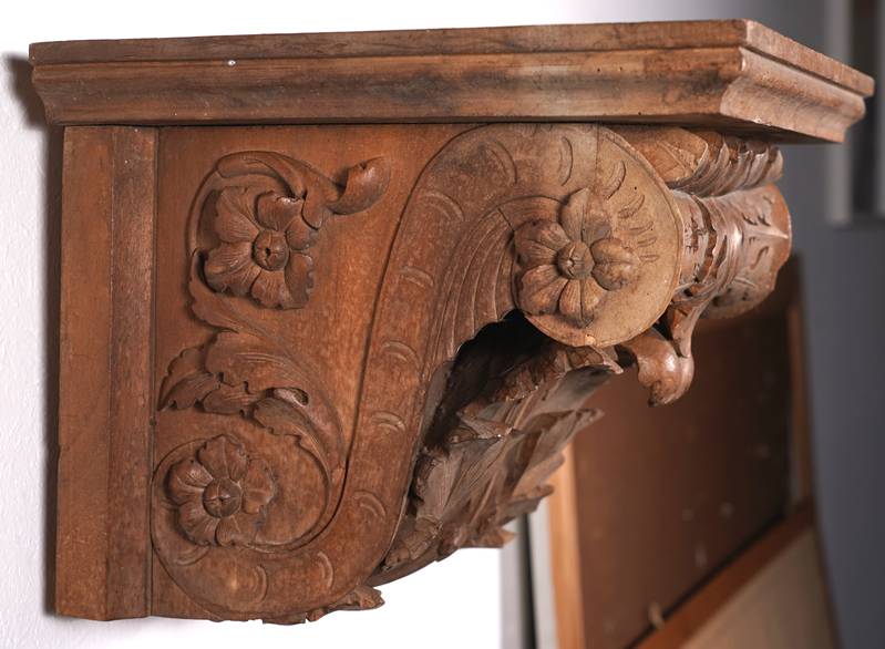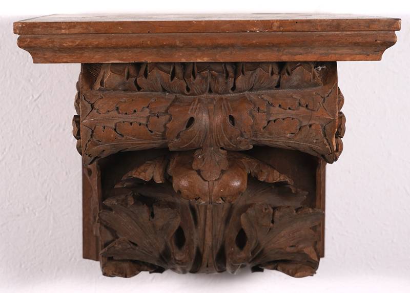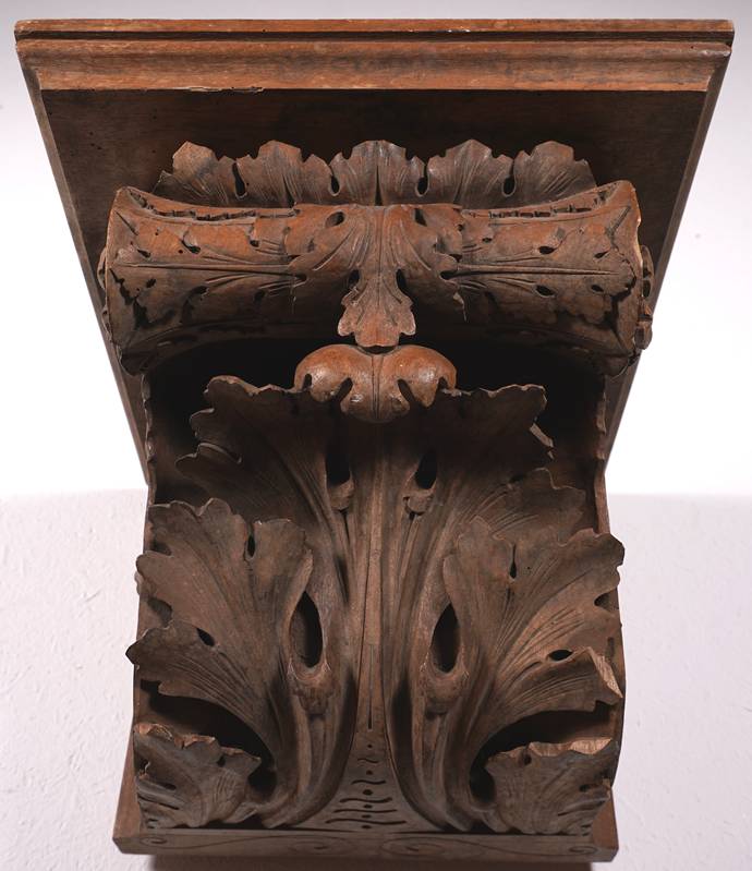 Holzwerkstatt St. Blasien 19. Jh. Holzkapitell eines Pilasters mit geschnitzten Akanthusblättern und Blumen. Oben mit Sammleretikett. Größe ca. 33,5 x 35 cm, Höhe ca. 28 cm, Gewicht ca. 6,3 kg. Teils bestoßen. Aus der Sammlung von Hans Jakob Wörner, dem zuständigen Denkmalpfleger bei der Restauration von St. Blasien.