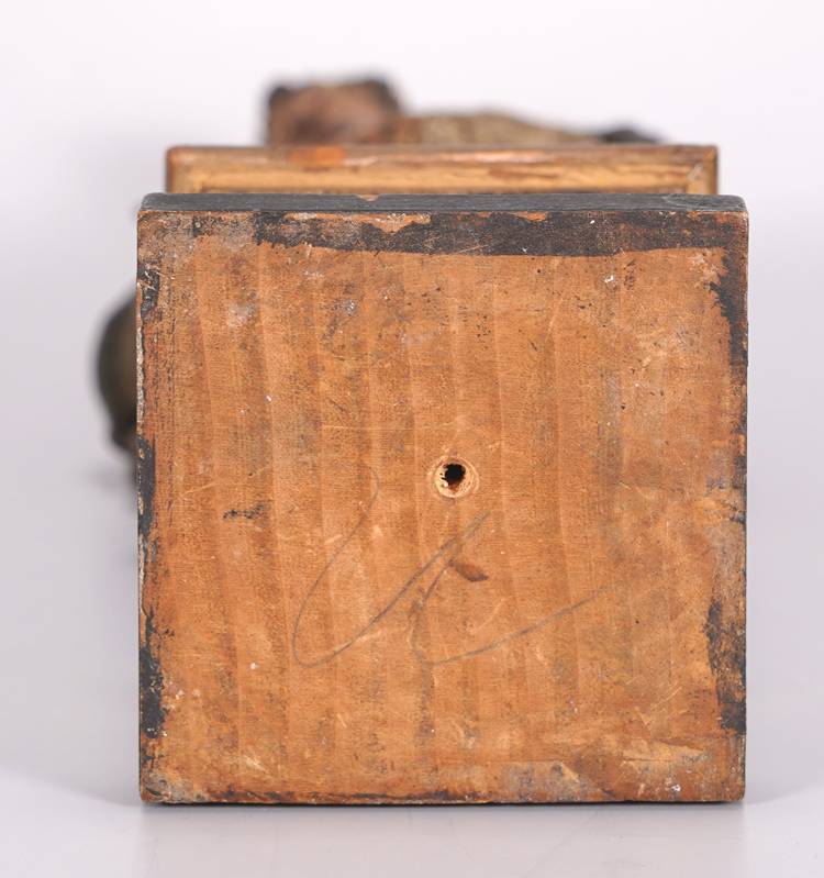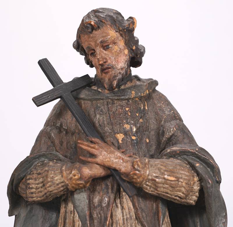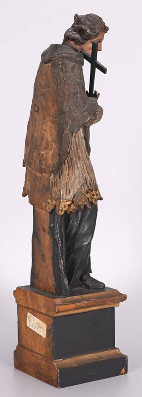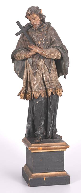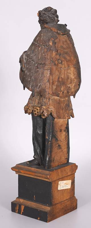 Holz, dreiviertel rund geschnitzt, polychrom gefasst. Im Renaissancestil. Größe ca. 10 x 7 cm, Höhe ca. 30 cm. Teils bestoßen, teils berieben.