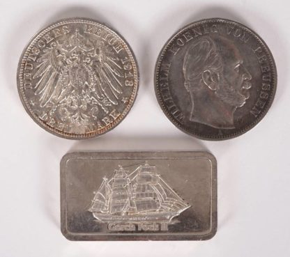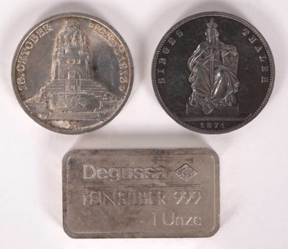 Zwei Münzen Kaiserreich Siegestaler 1871 und Drei Mark Münze 1913 E Völkerschlachtdenkmal. Dabei ein Degussa Barren 1 Unze Feinsilber, Gewicht ca. 31,1 Gramm.