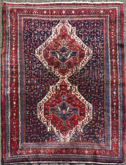Persien ca. 1940, Wolle auf Baumwolle. Sieben Bordüren und zwei große Medaillons im Innenfeld. Vorwiegend in den Farben Rot und Blau gehalten. Größe ca. 206 x 305 cm, ca. 15 Knoten/qcm.