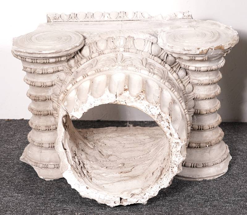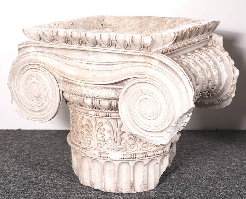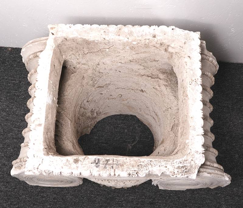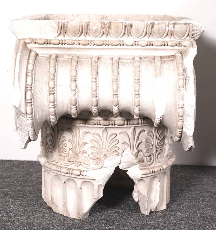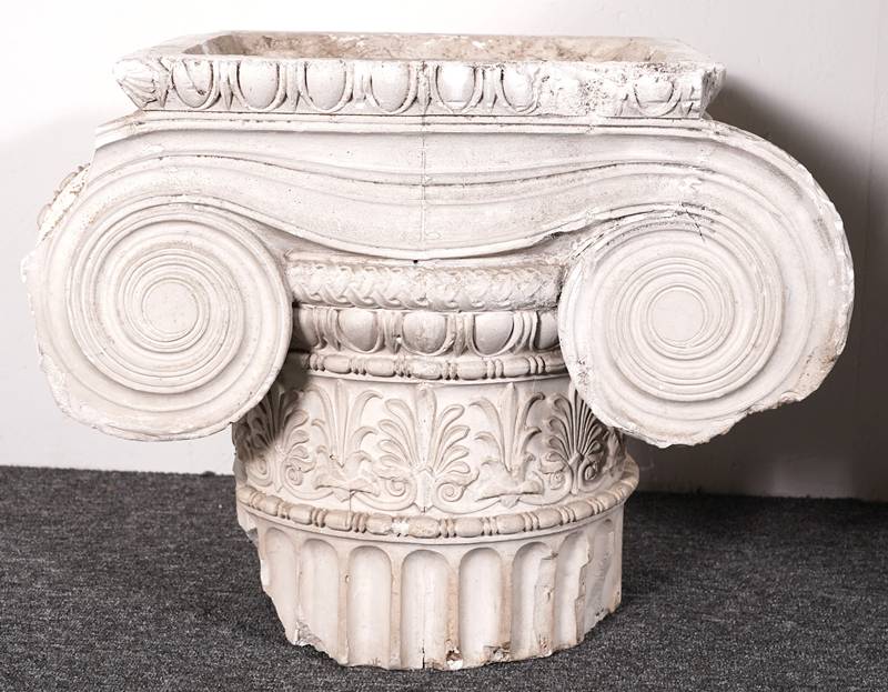19. Jh. Kapitell mit Ionischer Schnecke und korinthischem Fries. Größe ca. 55 x 40 cm, Höhe ca. 44 cm. Provenienz laut Einlieferer: Gipsgießerei St. Blasien. Aus der Sammlung von Hans Jakob Wörner, dem zuständigen Denkmalpfleger bei der Restauration von St. Blasien. Teils bestoßen. Kein Versand möglich, wir empfehlen gerne eine Spedition.