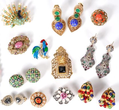 Großes Modeschmuckkonvolut Diverse Ensembles mit Ketten, Colliers und Ohrschmuck sowie Broschen wie abgebildet. Bitte selbst besichtigen.