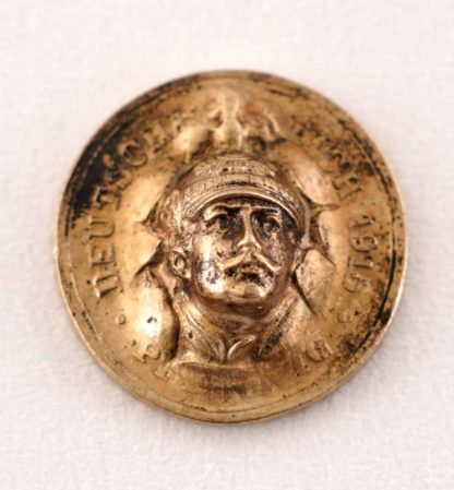 Patriotenpfennig Wilhelm II. Deutsch 1915. Kaiserreich Kleinmünze, Patriotenpfennig 1915, wohl vergoldet. Mit plastisch herausgetriebenem Kopf von Kaiser Wilhelm II. Durchmesser ca. 1,9 cm. In Sammlersachet. Berieben.