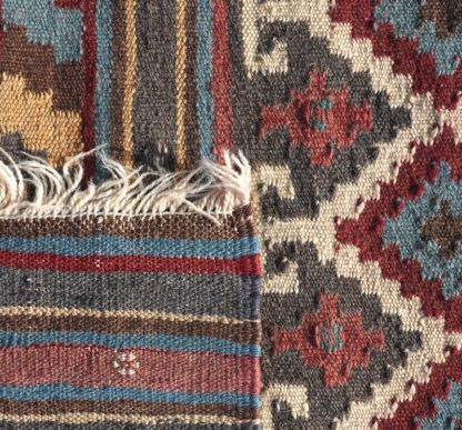 Kelim Um 1940. Mehrfachbordüre. Im Innenfeld geometrische Muster in Bahnen. Größe ca. 240 x 155 cm, ca. 4 x 4 Knoten/qcm.