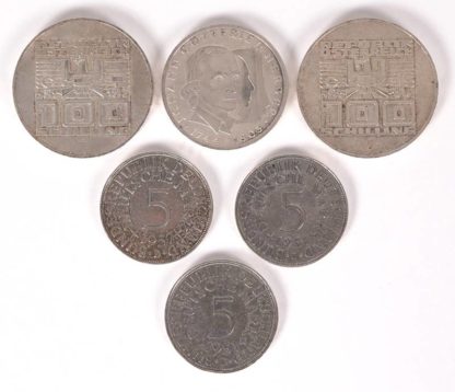 Konvolut Münzen 3 x 5 DM Stück (2 x 1951, 1957) 1 x 10 DM Stück1994, 2 x 100 Schilling Österreich. Zustand wie abgebildet.
