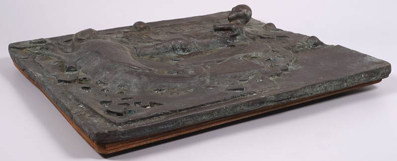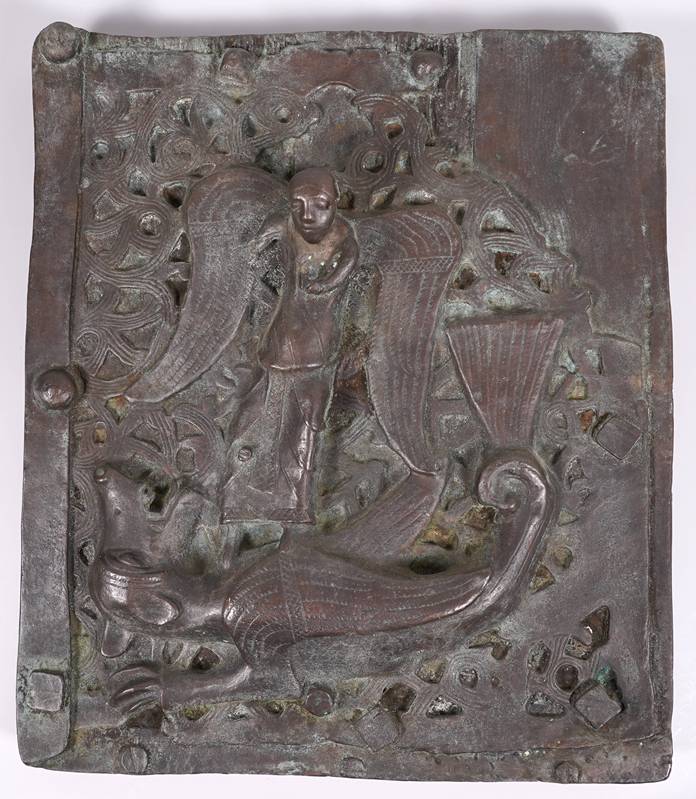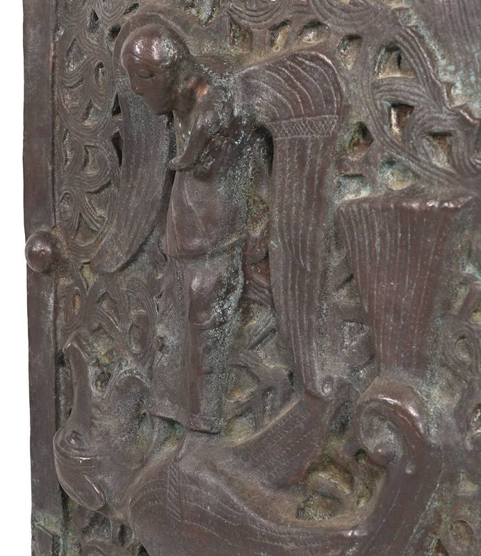 Neuzeitliche Reproduktion einer romanischen Reliefplatte der rechten Bronzetür von San Zeno (12. Jh.), Verona. Metallguss auf Holz montiert. Erzengel Michael im Kampf mit dem Drachen. Position am Original: rechte Tür, unterste Reihe, rechts außen. Größe ca. 47 x 40 cm, Gewicht ca. 9,7 kg.