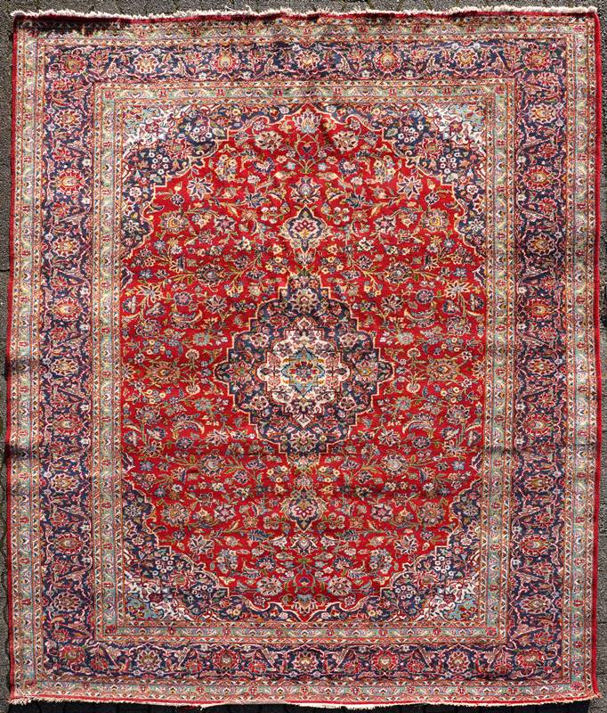 Keshan Persien um 1940. Wolle. Drei Bordüren, Innenfeld mit floralem Muster und Eckzwickeln, in der Mitte ein Medaillon. Größe ca. 370 x 270 cm, ca. 20 Knoten/qcm. Mit Gutachten.