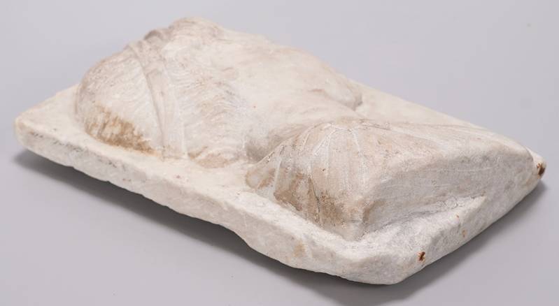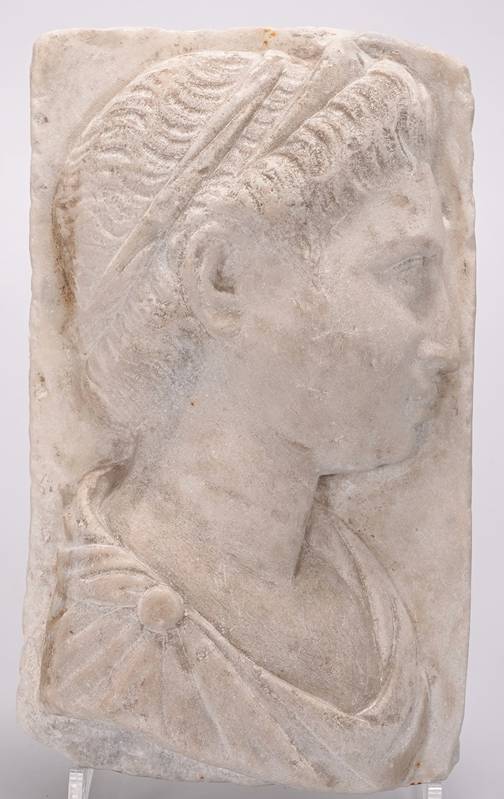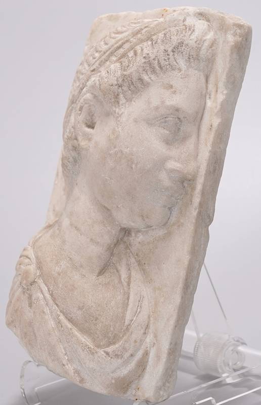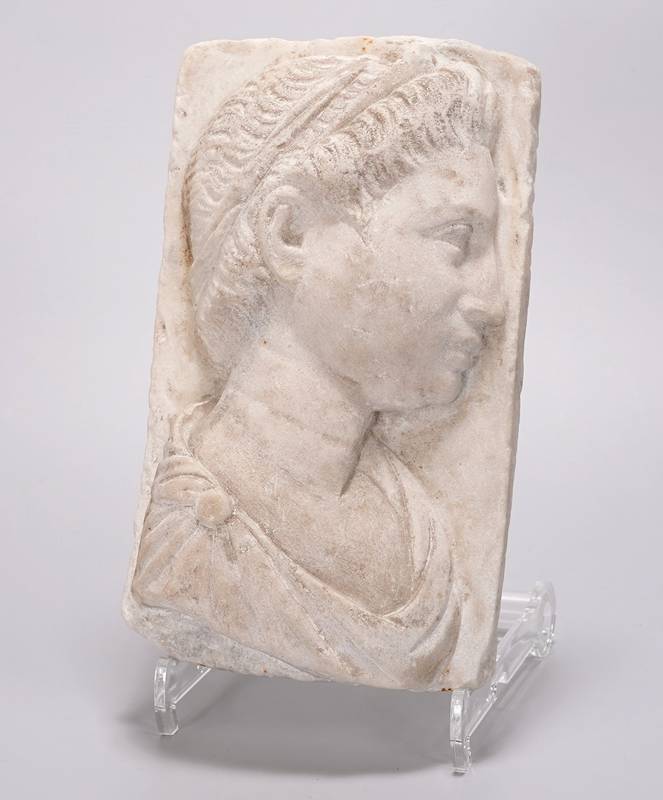 Marmor-Fragment mit reliefierter Profildarstellung eines jungen Manns. Größe ca. 20 x 11 cm. Gewicht ca. 1,8 kg. Zustand wie abgebildet, bitte selbst besichtigen.