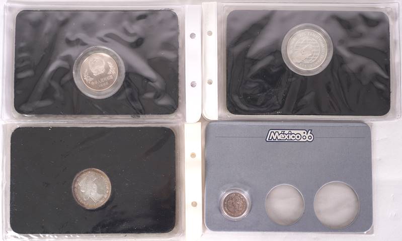 Konvolut Fußball Münzen Drei Silbermünzen der Sonderedition zur Fußball WM 1982, Türkei, Bulgarien und China. Dazu eine kleine Silbermünze zur WM 1986 Mexiko. Je in Kapsel oder Blister.