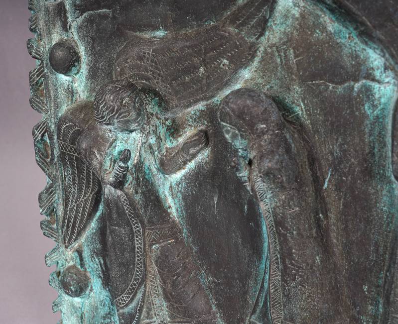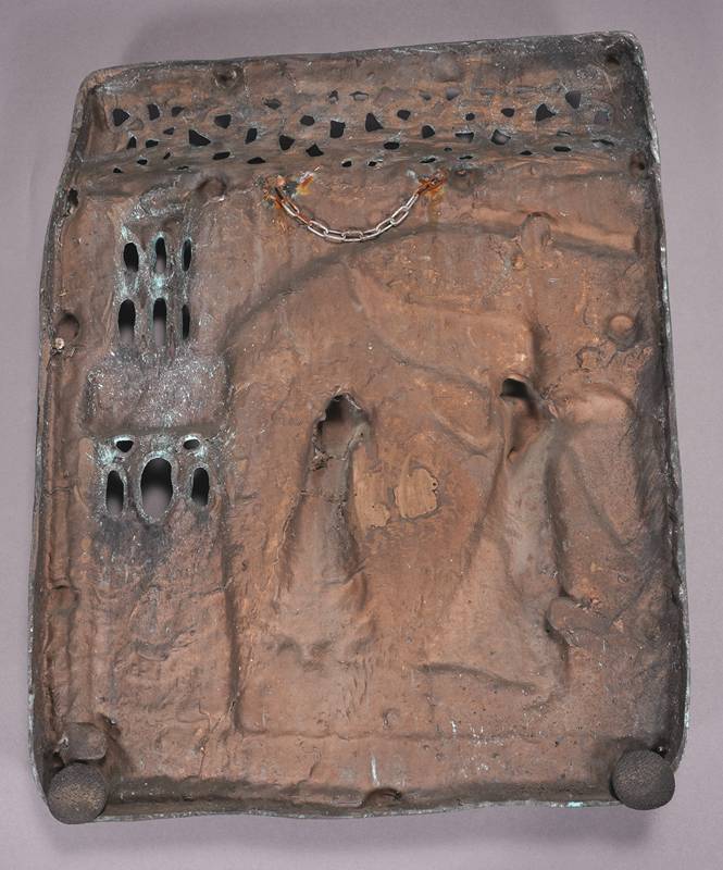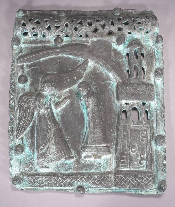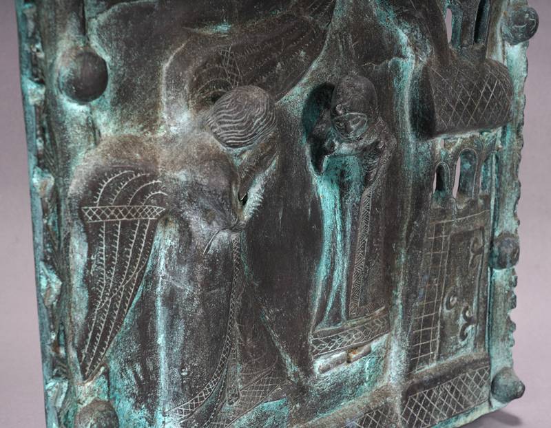 Neuzeitliche Reproduktion einer romanischen Reliefplatte der Bronzetür von San Zeno (12. Jh.), Verona. Metallguss, patiniert. Die Verkündigung. Größe ca. 50 x 42 cm, Gewicht ca. 12,3 kg. Zustand wie abgebildet.