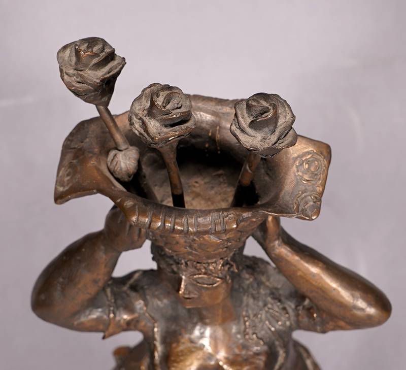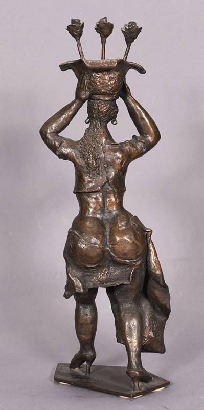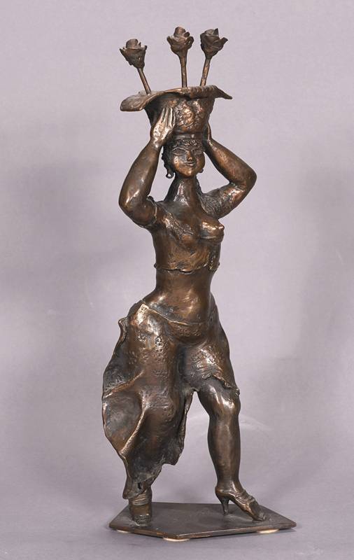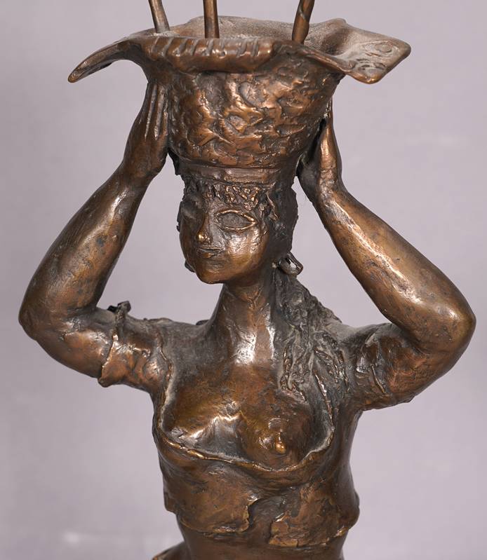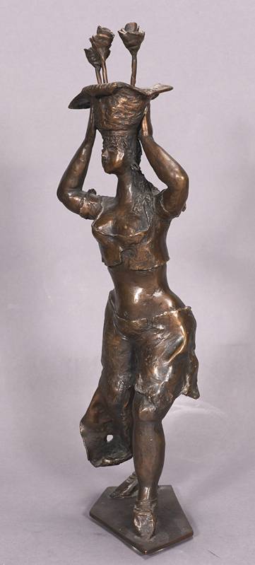 1916 Düsseldorf - 2005 München. Junge Frau mit Blumenschale auf dem Kopf. Metallguss. Größe ca. 16 x 9 cm, Höhe ca. 44 cm. Gewicht ca. 2,88 kg. Zustand wie abgebildet.