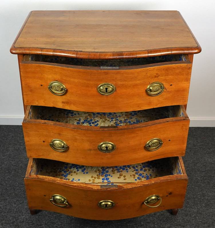 Barocke Kommode Nussbaum. Dreischübiger Korpus mit bewegter Front auf vier ausgestellten Beinen. Größe ca. 67 x 47 cm, Höhe ca. 86 cm. Teils bestoßen, Zustand wie abgebildet.
