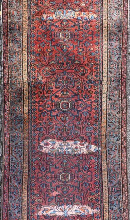 Persische Galerie 20. Jh. Dreifachbordüre mit floral gemustertem Innenfeld auf rotem Grund. Größe ca. 495 x 80 cm, ca. 5x4 Knoten/qcm. Schlecht farblich restauriert.