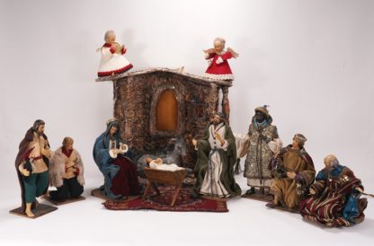 Gießen erste Hälfte 20. Jh. Künstlerin Gretel Glatthaar aus Dresden. Kunstvoll hergestellte Wachsfiguren in wertvollen Gewändern. Maria, Joseph, das Christuskind, die heiligen drei Könige, zwei Hirten und Engel sowie der Esel. Dazu der Stall. Größe des Stalls ca. 36 x 13 cm, Höhe ca. 33 cm. Altersbedingter Zustand, siehe Fotos.
