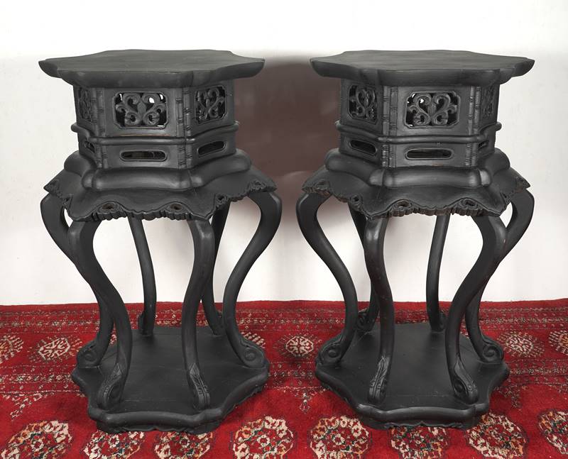 Paar Asia Beistelltischchen China 20. Jh. Ebonisiertes, geschnitztes Holz. Pagodenform auf geschweiften Beinen über sechseckig, geschweiftem Sockel. Durchmesser ca. 50 cm, Höhe ca. 74 cm.