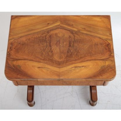 Süddeutsch um 1830. Nussbaum, furniert. Die tief eingezogene Bodenplatte dieses ungewöhnlichen Möbels sitzt auf fein gedrechselten Füßen. Der Schwung der Oberfläche setzt sich in den volutierten Seitenstäben samt regionaltypischen Rosettenapplikationen und in den eingestellten Volutenbeinen fort. Sinnfällig drücken diese in ihrer Bewegung das Tragen des Zargenschubes aus. Ein in seiner Gestaltung seltenes Möbel von überraschender Leichtigkeit. Größe ca. 63 x 45 cm, Höhe ca. 86 cm. Minimal bestoßen.