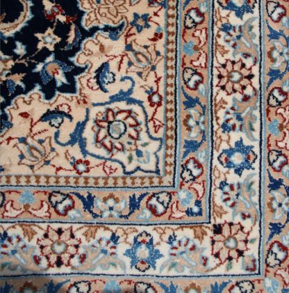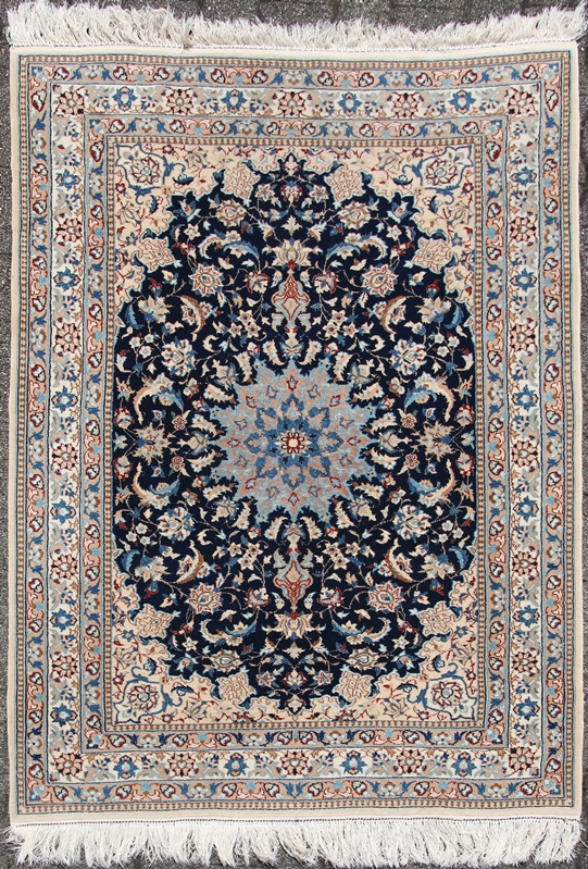 Teppich Ghom 20. Jh. Medaillonteppich mit Seidenanteil in schönen Blautönen. Größe ca. 170 x 115 cm, ca. 25 Knoten/qcm.