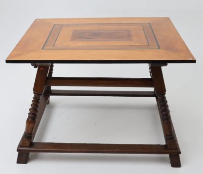 Bauerntisch Deutsch 19. Jh. Eiche, Platte Ahorn furniert. Tischplatte mit Einlegearbeiten. Geometrisches Muster. Beine gedrechselt. Größe ca. 108 x 91,5 cm, Höhe ca. 77 cm. Altersbedingter Zustand.