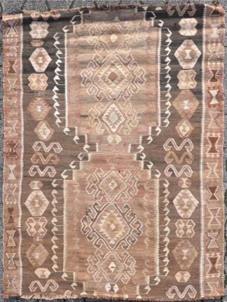 Kelim Um 1940. Mehrfachbordüre. Im Innenfeld geometrische Muster in Bahnen. Größe ca. 240 x 155 cm, ca. 4 x 4 Knoten/qcm.