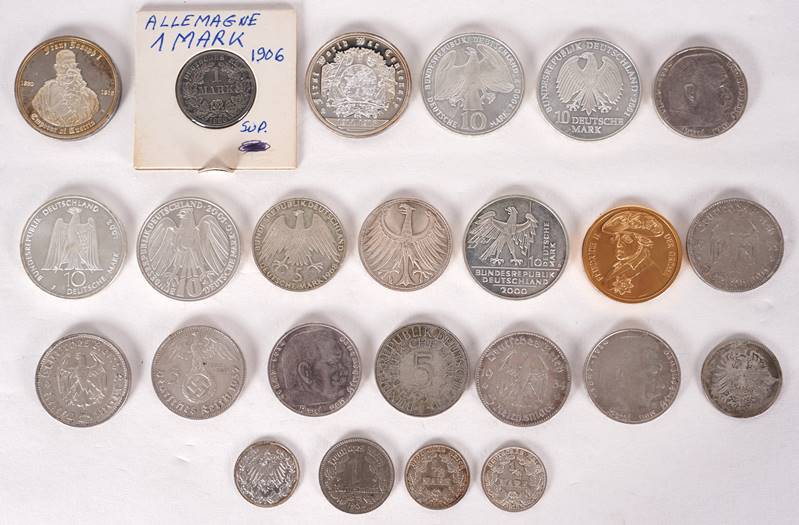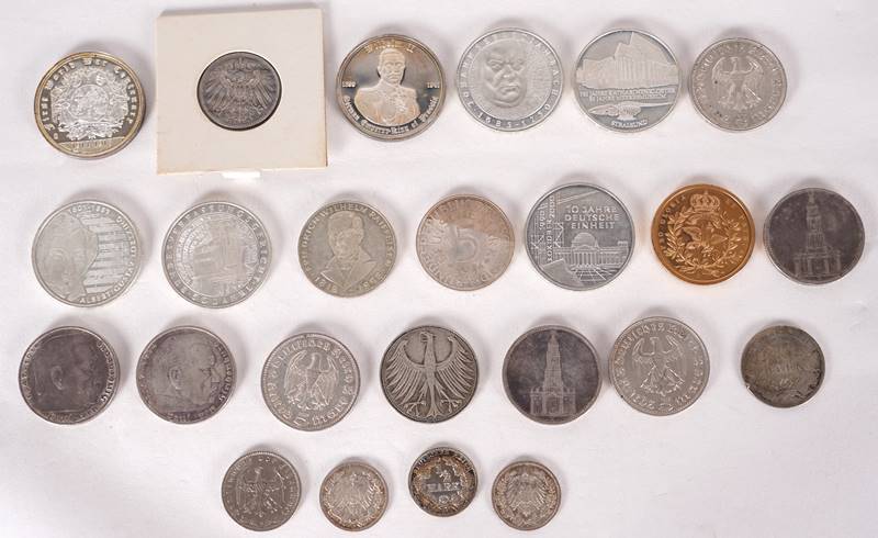 Konvolut deutsche Währung 3 x 1 Deutsche Reichsmark und 3 x 1/2 Deutsche Reichsmark (Kaiserreich), 4 x 5 Deutsche Reichsmark (1935+1936), 3 x 5 Deutsche Reichsmark (Drittes Reich), 3 x 5 Deutsche Mark und 5 x 10 Deutsche Mark (BRD). Dazu zwei Gedenkmedaillons zum 1. Weltkrieg Wilhelm II. und Franz Joseph I. und ein Gedenkmedaillon Friedrich II der Große.