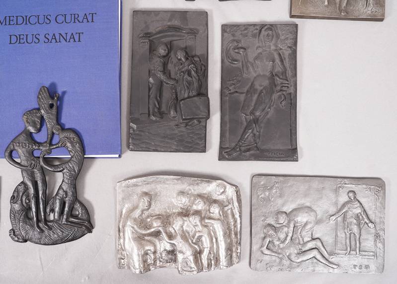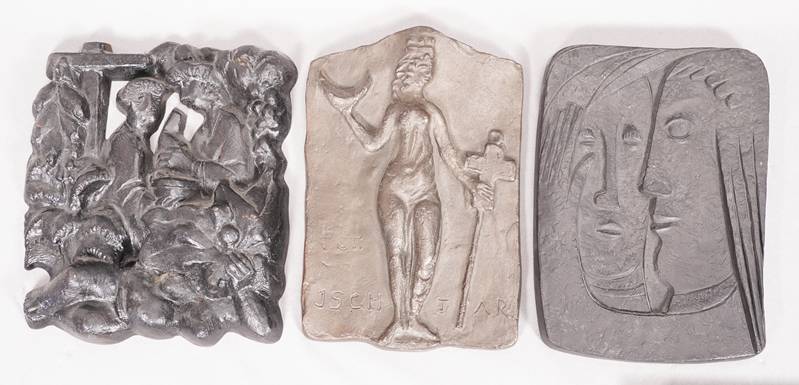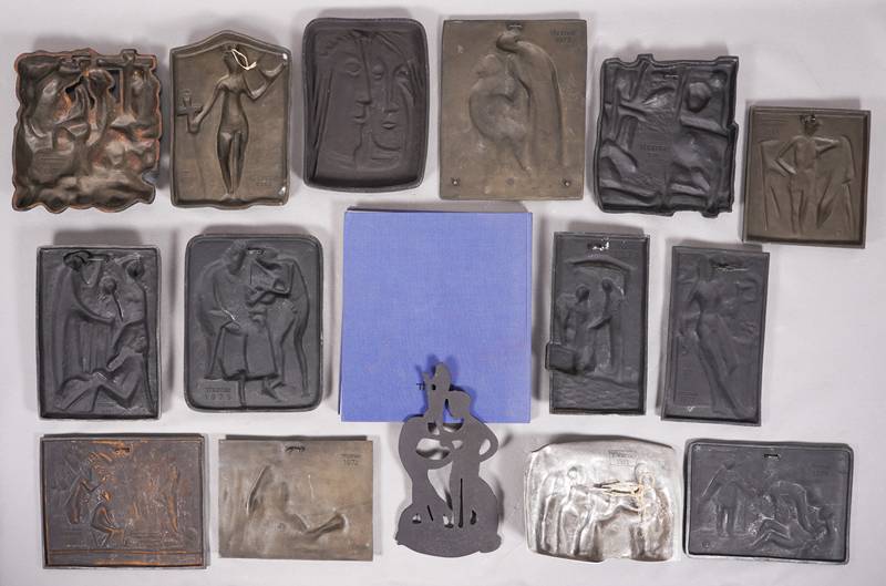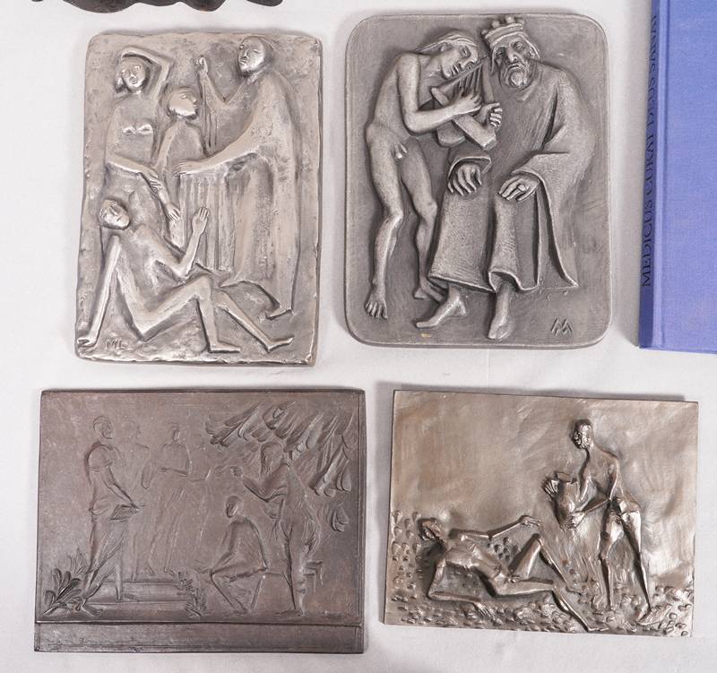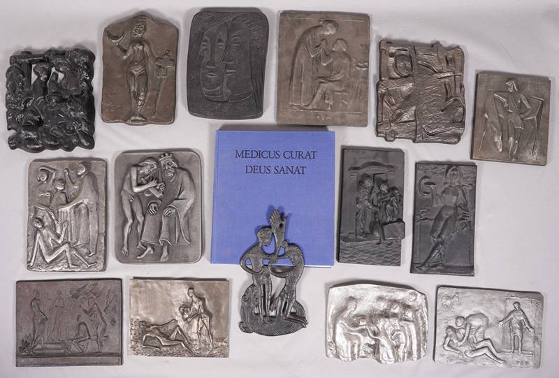 15 Jahresplaketten der Dr. Karl Thomae GmbH Edition zum Thema Heilkunst der Jahre 1963, 1965-1968 und 1970-1979. Verschiedene Künstler: Toni Stadtler, Roland Friederichsen, Fritz Melis, Elmar Hillebrand, Martin Mayer, Ewald Mataré, Toni Schneider-Manzell, Jürgen Weber, Maria Munz-Natterer, Max Faller, Hubert Klinkel, Marianne Lüdicke, Hilde Broer und Kurt Schwippert. Meist Eisen, bei Buderus AG gegossen, einmal Aluminium. Maximale Größe ca. 23 x 18 cm. Gesamtgewicht ca. 13,5 kg. Katalog anbei. Zustand wie abgebildet.