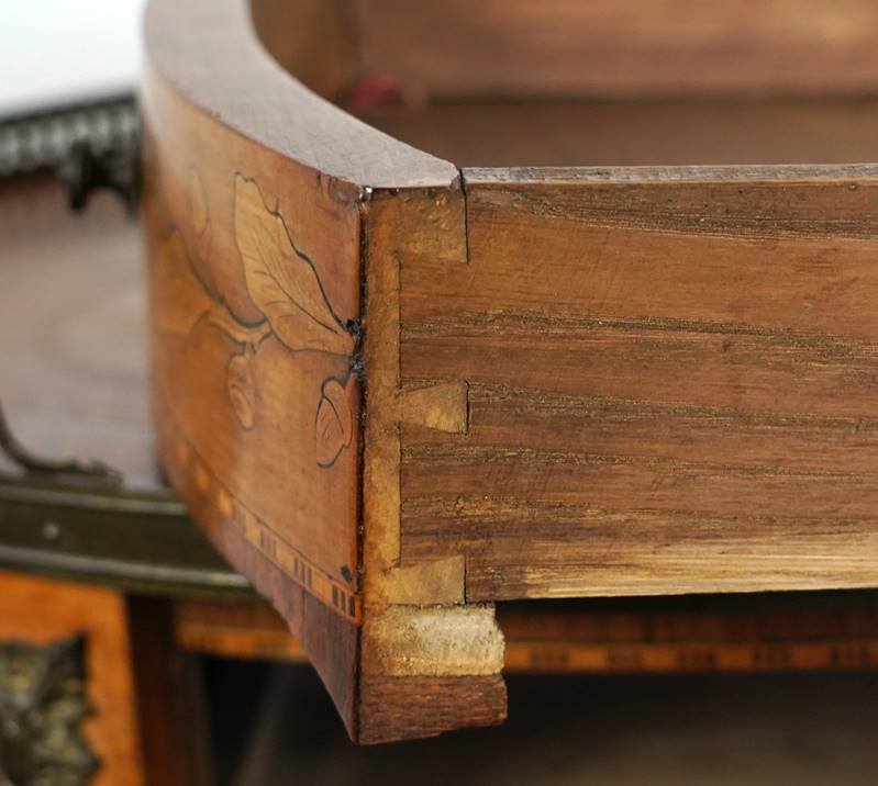 Konsoltischen 19. Jh. Verschiedene Hölzer. Ovaler Korpus mit einer Schublade auf vier ausgestellten Beinen mit einer nierenförmigen Konsole. Flächen mit kunstvollen Intarsien in Form von Blumen und Tieren. Tischplatte von durchbrochen gearbeiteter Umrandung gesäumt. Größe ca. 51 x 37 cm, Höhe ca. 72 cm. Teils bestoßen, teils gerissen.