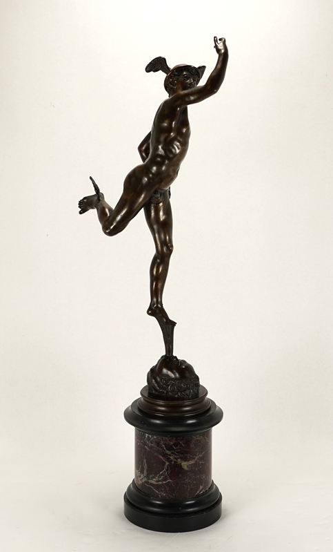 Hermes Figur Rom 20. Jh. Der Götterbote Hermes nach dem Vorbild von Giambologna. Bronze patiniert. Unten unleserlich bezeichnet ...lla Roma. Auf rundem Marmorpodest aufgesteckt. Größe Figur ca. 23 x 15 cm, Höhe ca. 47 cm, Gewicht ca. 2 Kilogramm. Höhe Podest ca. 15 cm, Gewicht ca. 2,9 Kilogramm. Bohrung im Fuß, der Stab gebrochen. (Nr. 142). Hermes figure. Rome 20th century. Hermes, messenger of the gods, after the model of Giambologna. Patinated bronze. Below illegibly inscribed ...lla Roma. Mounted on a round marble pedestal. Size of figure approx. 23 x 15 cm, height approx. 47 cm, weight approx. 2 kilograms. Height of pedestal approx. 15 cm, weight approx. 2.9 kilograms. Hole in the foot, the rod broken.
