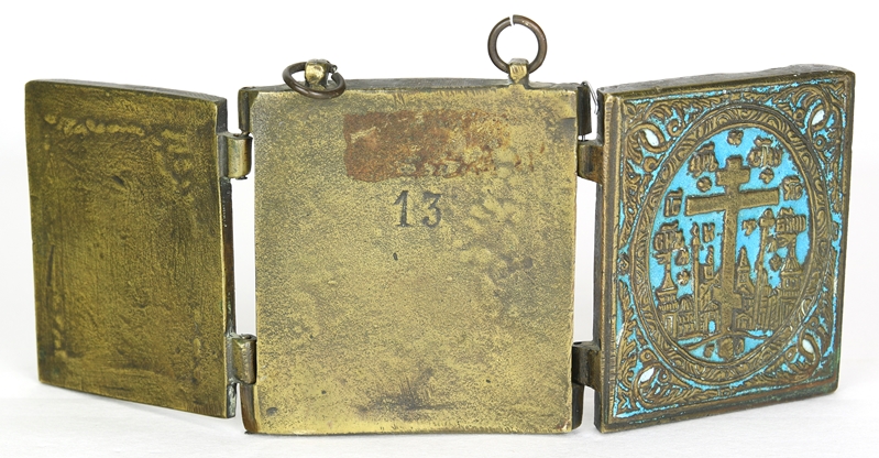 Russland 19. Jh. Bronze, teils polychrom emailliert. Größe ca. 7,5 x 7 cm (zugeklappt). Scharnier gelöst.