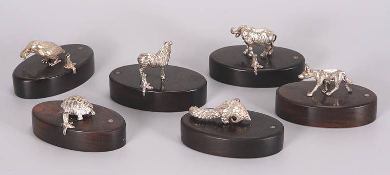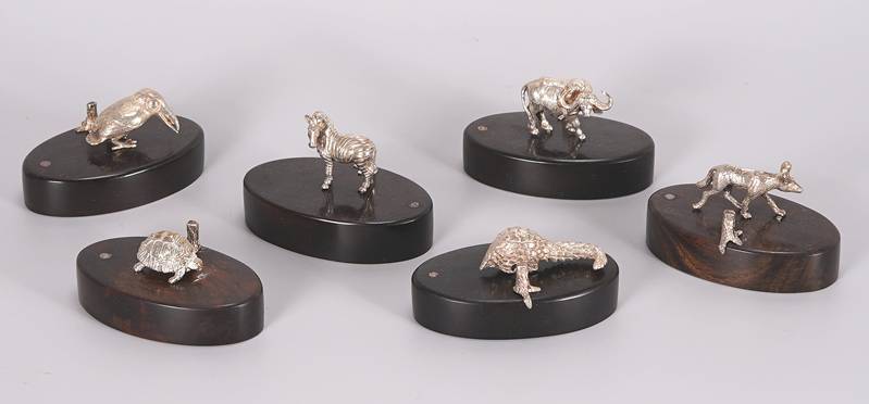 Mavros, Patrick 1954 Zimbabwe. Schwarzholz und Sterlingsilber. Sechs Platzkartenhalter: Ein Zebra, ein Wildhund, ein Eisvogel, ein Büffel. ein Gürteltier und eine Schildkröte. Je auf dem Podest und der Figur mit Herstellermarke. Größe je ca. 6 x 3,5 cm, Höhe ca. 3,5 cm. Figuren teils lose aufgesteckt. Anbei passende Platzkarten.