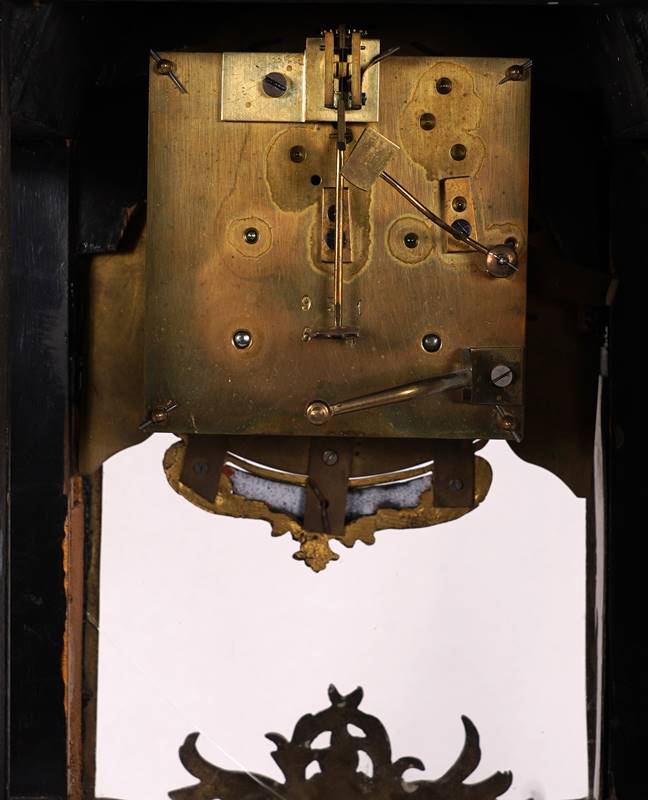 Kaminuhr Frankreich um 1800. Ebonisierter Holzkorpus mit Boulle- Marketerie aus Messing in Schildpatt und Bronzemonturen in Akanthus- und Rocaillenformen, auf vier Löwenfüßen, gekrönt von einem vollplastischen Engelchen auf der Weltkugel mit Fackel in der Hand. Verglaste Front sowie Seiten. Ziffernblatt. Reliefiertes Bronzeziffernblatt mit emaillierten Kartuschen mit römischen Stundenzahlen. Unter dem Ziffernblatt Emailleblatt mit Signatur Thuret Paris. Innenraum mit Rückwand ebenfalls mit aufwendiger Boulle- Marketerie. Ankerwerk mit Sonnenpendel an Feder. Schlag zur vollen und halben Stunde auf Glocke. Auf dem Werk nummeriert. Größe ca. 23 x 13 cm, Höhe ca. 53 cm. Läuft an, schlag löst aus. Teils bestoßen, vordere Glasscheibe gesprungen.