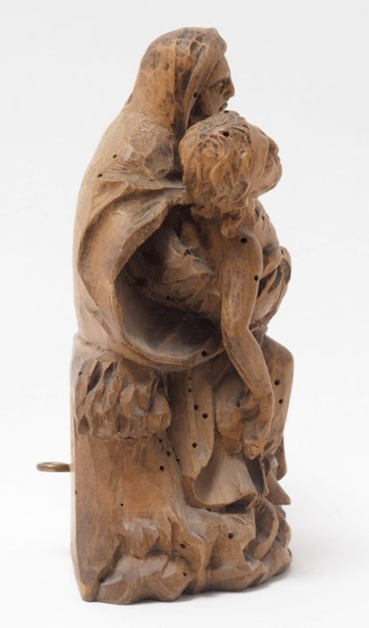 Süddeutsch 16. Jh. Lindenholz geschnitzt. Unter dem Boden Meisterzeichen AK ?. Größe ca. 11 x 5,5 cm, Höhe ca. 16 cm. Schöner Zustand. Zugehörige Expertise mit Rechnung über 6.800.- CHF der Galerie Wey in Luzern aus dem Jahre 1992.