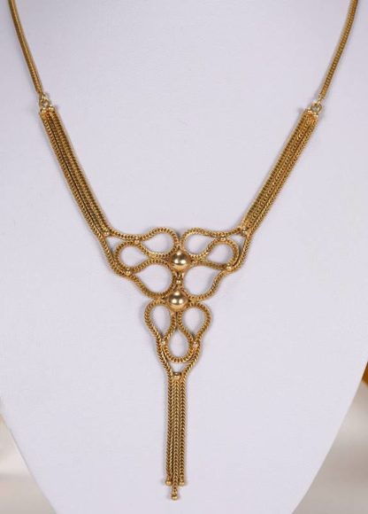Außergewöhnliche Collierkette 1980er Jahre. Gelbgold 750 punziert und Herstellermarke. Flachpanzerkette, teils mit Goldkugeln, Klickverschluss. Länge ca. 44 cm, Gewicht ca. 22,6 Gramm.