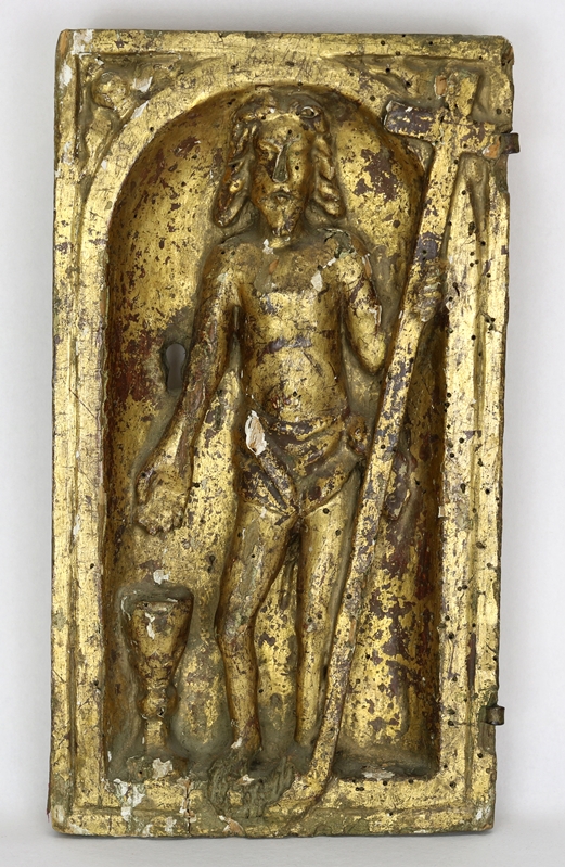 Wohl deutsch 16./17. Jh. Relief mit stehendem Johannes mit Kreuzstab auf den Kelch deutend. Holz geschnitzt und über Kreidegrund goldstaffiert. Größe ca. 27 x 15,5 cm.