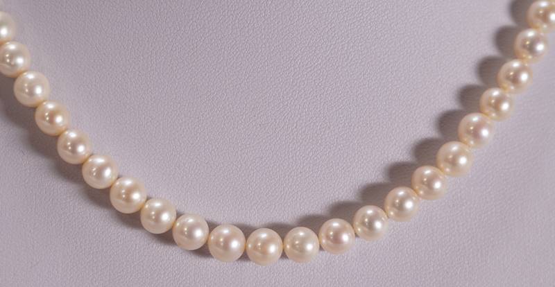 Perlenkette mit Goldverschluss Deutsch 20. Jh. Runde, etwas unregelmäßige Perlen (bis ca. 7 mm) und Gelbgoldverschluss, 585 punziert. Länge ca. 40 mm, Gewicht ca. 23,3 Gramm.