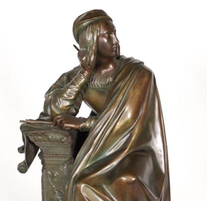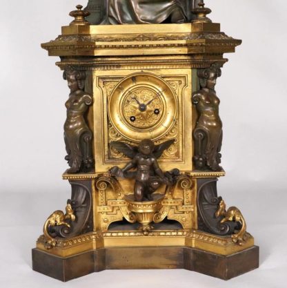 Renaissance des Arts Frankreich 19. Jh. Bronze, teils goldfarben gefasst. Hochrechteckiger Sockel mit Betonung der Ecken durch herauskragende Pilaster. Die vorderen beiden Pilaster im unteren Teil dekoriert mit Gargoyles. Im oberen Teil jeweils eine Karyatide, welche das Ziffernblatt einrahmen. Unter dem Ziffernblatt geflügelter Erot mit Banderole. Darauf Schriftzug Renaissance des Arts. Auf dem Sockel die Figur eines Renaissancekünstlers mit Pinseln und Skizzen. Goldfarbenes Ziffernblatt mit römischen Stundenzahlen (stark berieben). Pendulenwerk mit Federaufhängung mit Schlag zur vollen und halben Stunde. Auf dem Werk mehrfach nummeriert. Größe ca. 34 x 26 cm, Höhe ca. 68 cm, Gewicht ca. 21,5 kg. Pendel und Glocke fehlen, Uhrenzylinder ist lose.