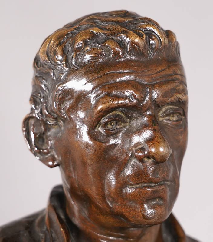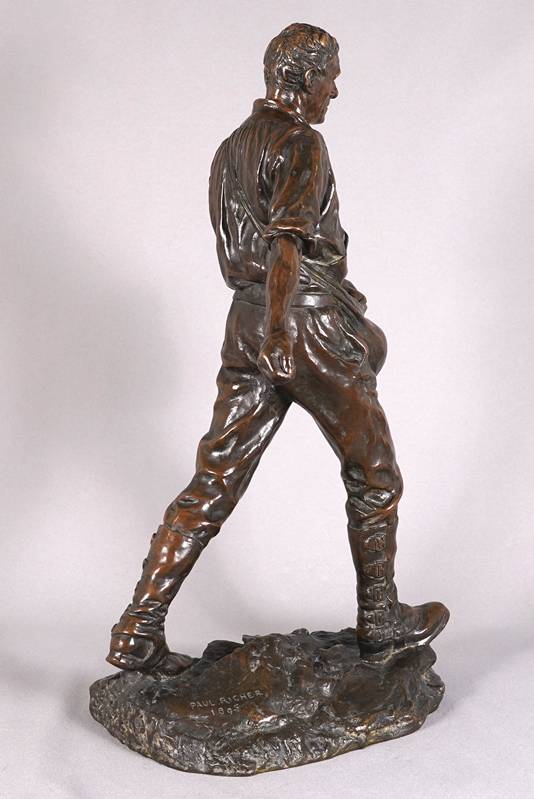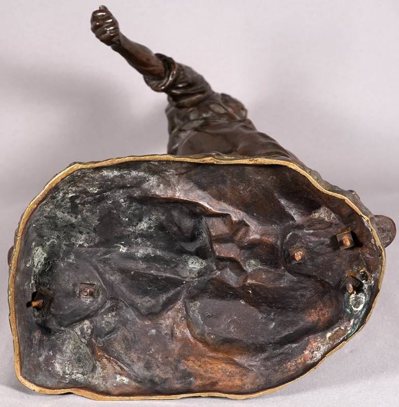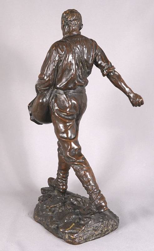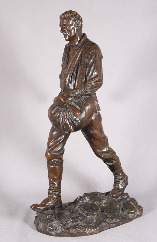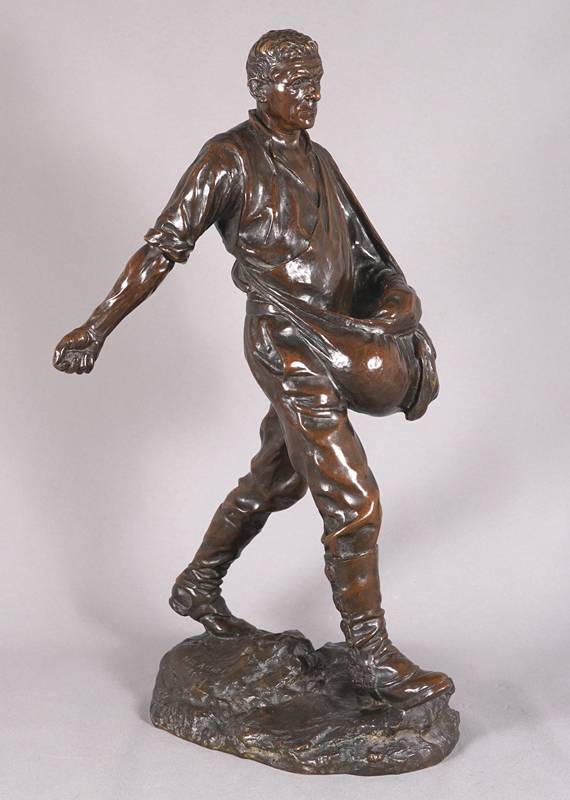 1849 Chartres - 1933 Paris. "Le semeur". Bronze, patiniert. Auf dem Sockel signiert und datiert 1895. Hinten auf dem Sockel mit Gießereistempel "Susses Freres Editeurs Paris", daneben ein "M". Größe ca. 35 x 23 cm, Höhe ca. 62 cm, Gewicht ca. 15 kg. Teils berieben. Kein Versand möglich, wir empfehlen gerne eine Spedition.