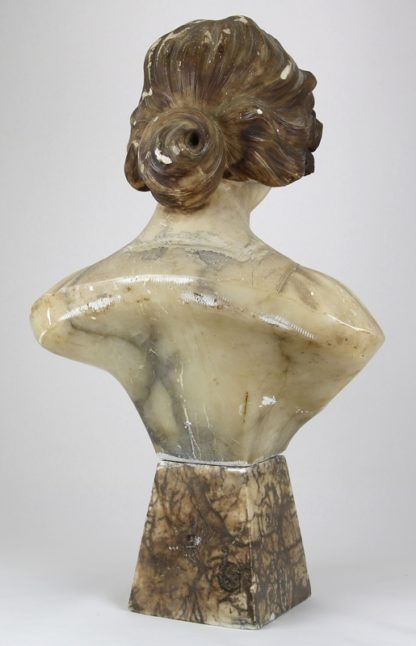 um 1900. Skulptur betitelt Mery. Größe ca. 34 x 18 cm, Höhe inklusive Sockel ca. 54 cm, Gewicht komplett ca. 21 Kilogramm. Altrestauriert.
