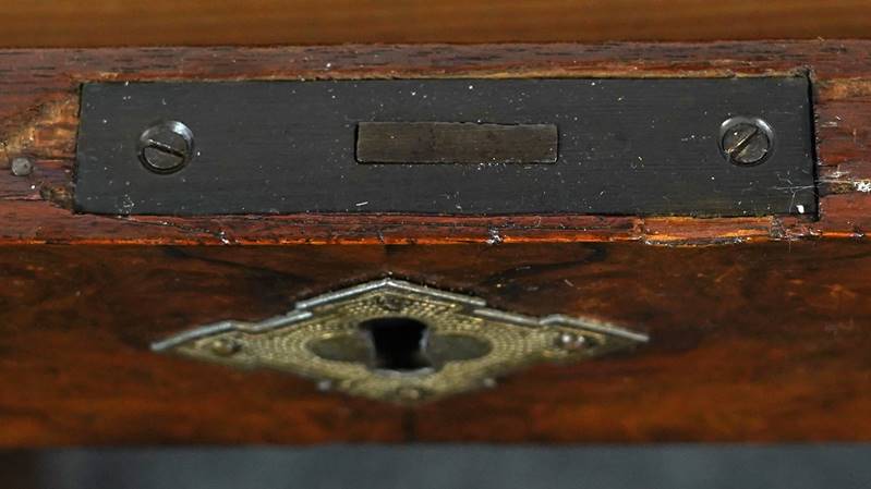 Nähtischchen Um 1900. Eiche. Zwei gedrechselte Beine auf zwei bügelförmigen Füßen im Verbund. Zweischübiger Korpus mit profilierter Platte. Größe ca. 45 x 38 cm, Höhe ca. 75 cm. Platte leicht beschädigt. Schlüssel anbei