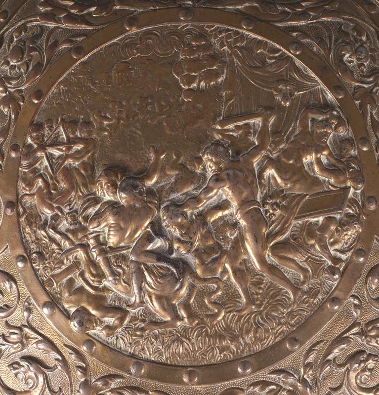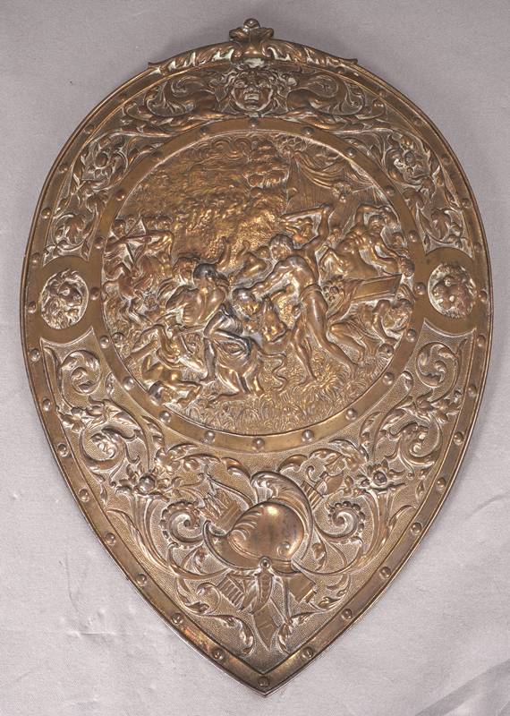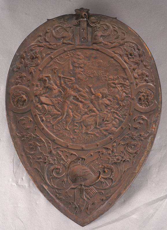 Wohl Ende 19. Jh. Eisenguss mit reliefierter Darstellung einer mythologischen Schlacht im zentralen Mittelfeld, umgeben von einem dekorativem Fries. Verso mit Hängevorrichtung sowie Seriennummer "2807" und Gießereistempel "D". Größe ca. 43 x 30 cm. Gewicht ca. 3 kg.