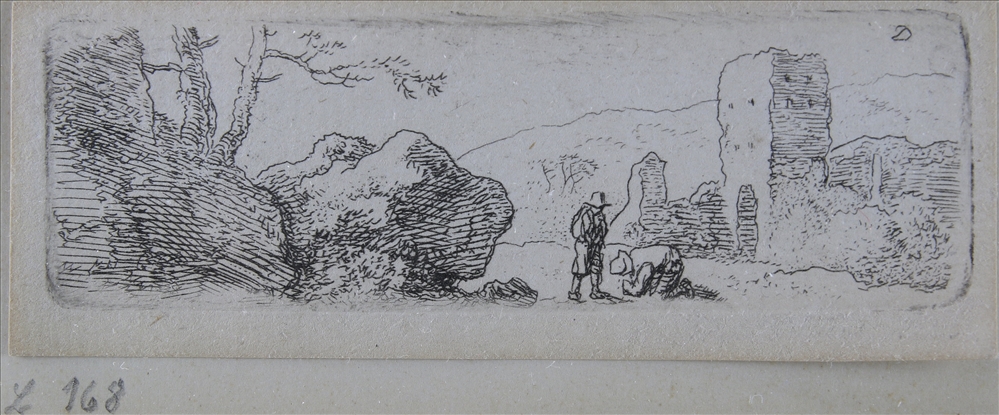 recte Christian Wilhelm Ernst Dietrich 1712 Weimar - 1774 Dresden. Vier Radierungen. Größen ca. 3 x 6,5 bis ca. 3,5 x 12,5 cm. Teils im Druck signiert bzw. datiert. In einem Rahmen hinter Passepartout und Glas gerahmt ca. 36,5 x 26 cm.
