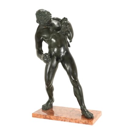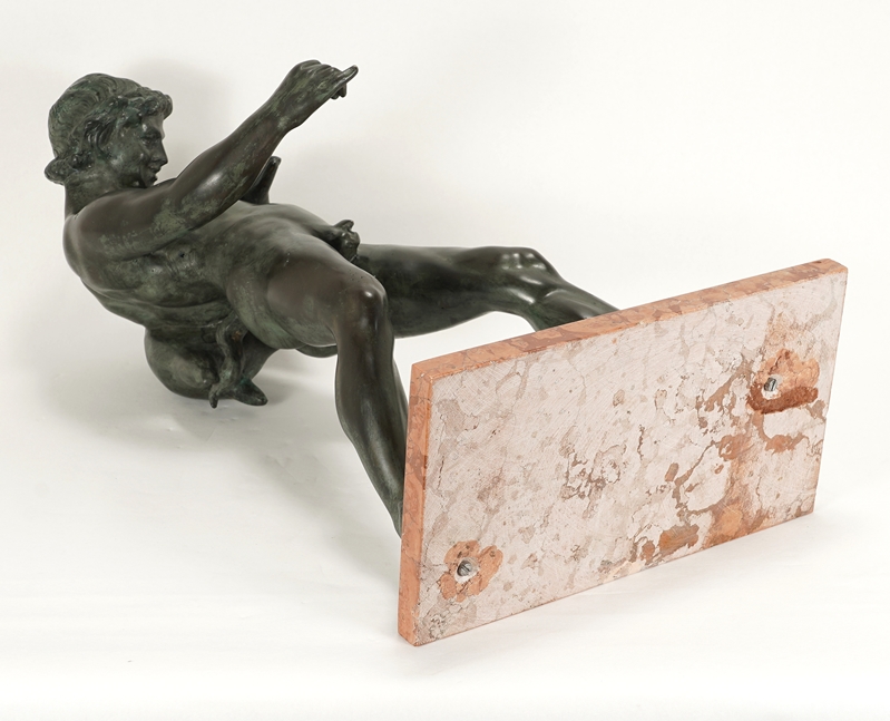 Um 1900. Bronze auf Steinplatte. Replik einer antiken Statue. Hinten auf Weinschlauch signiert F. de Luca. Größe ca. 31 x 17,5 cm, Höhe ca. 55 cm, Gewicht ca. 12 kg. Riss im Hals. (Nr. 131)