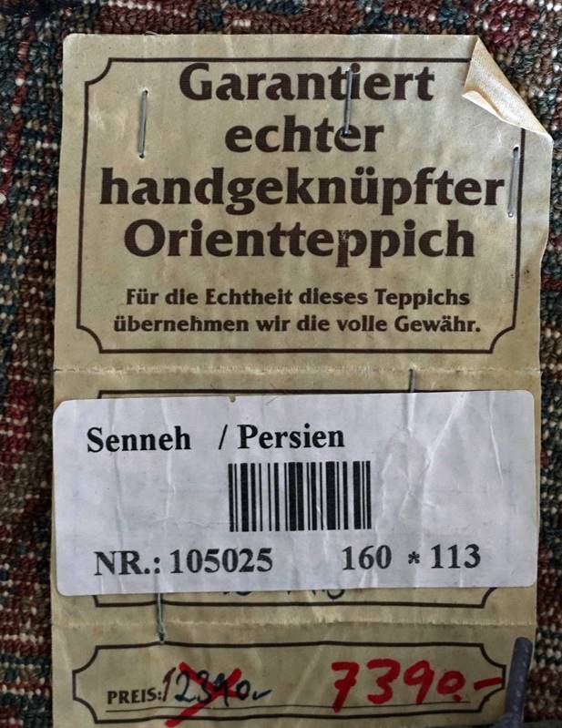 Senneh Persien 20. Jh. Dreifachbordüre mit durchgemustertem Innenfeld mit Medaillon . Verso Etikett mit Provenienz und ehemaligem Verkaufspreis von DM 7390,-. Größe ca. 160 x 112 cm, ca. 4 x 5 Knoten/qcm. Gewicht ca. 5,9 kg. Zustand wie abgebildet.